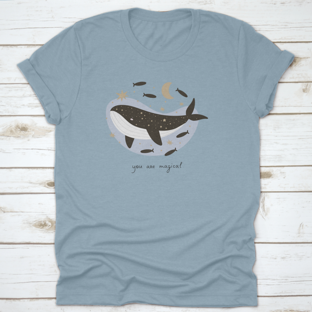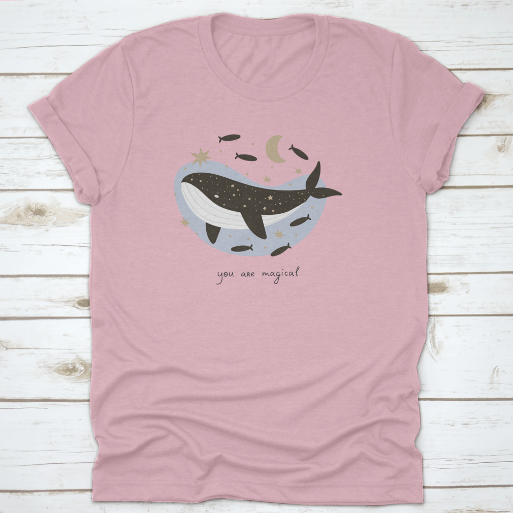 Colorful 'You Are Magical' t-shirt featuring a cartoon whale and hand-drawn lettering, made from soft cotton fabric.