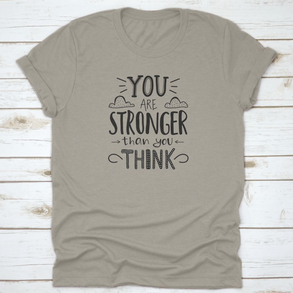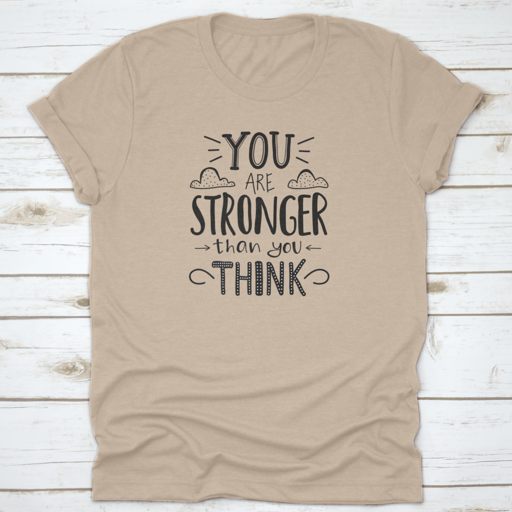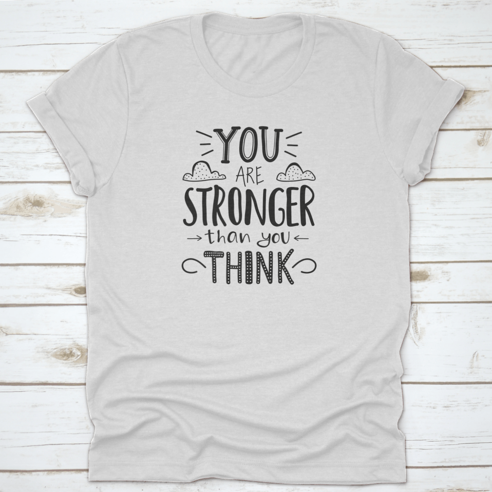 A motivational t-shirt featuring the quote 'You Are Stronger Than You Think', made from soft cotton fabric, displayed on a neutral background.