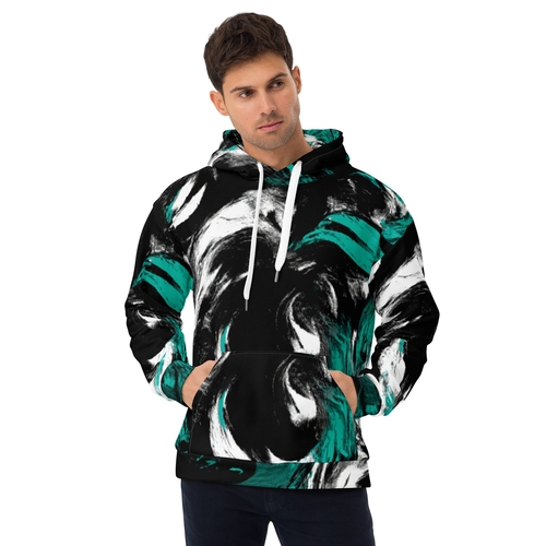 Introducing the Men's Graphic Hoodie in a striking black, green, and white abstract pattern, a must-have addition to your modern wardrobe. This hoodie is not just a piece of clothing; it's a fashion statement that combines comfort and style effortlessly. Designed for those who appreciate individuality, this hoodie features a dynamic all-over print that is sure to turn heads and make a lasting impression.