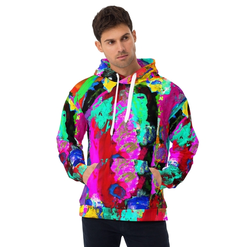 The standout feature of this hoodie is its dynamic all-over print. The multicolor abstract pattern is designed to capture attention and showcase your individuality. Whether you're heading out for a casual day with friends or lounging at home, this hoodie adds a bold and edgy touch to your outfit. The vibrant colors and unique design make it a versatile piece that can be paired with various bottoms, from jeans to joggers.
