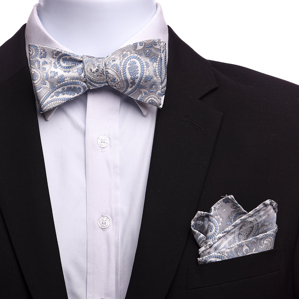 Introducing Amedeo's Men's Grey White Blue Paisley Silk Self Bow Tie & Handkerchief set, a perfect blend of classic elegance and modern style. This exquisite accessory is designed to make a strong fashion statement, allowing you to stand out from the crowd. Traditionally worn with tuxedos and formal shirts, today's fashion trends encourage pairing bow ties with any dress suit or sports jacket, making this set versatile for various occasions.