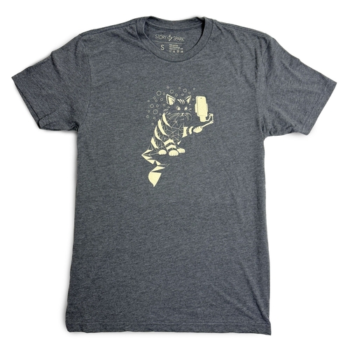 A stylish grey Snap Cat T-shirt featuring original illustrations, made from soft ring-spun cotton blend for comfort.