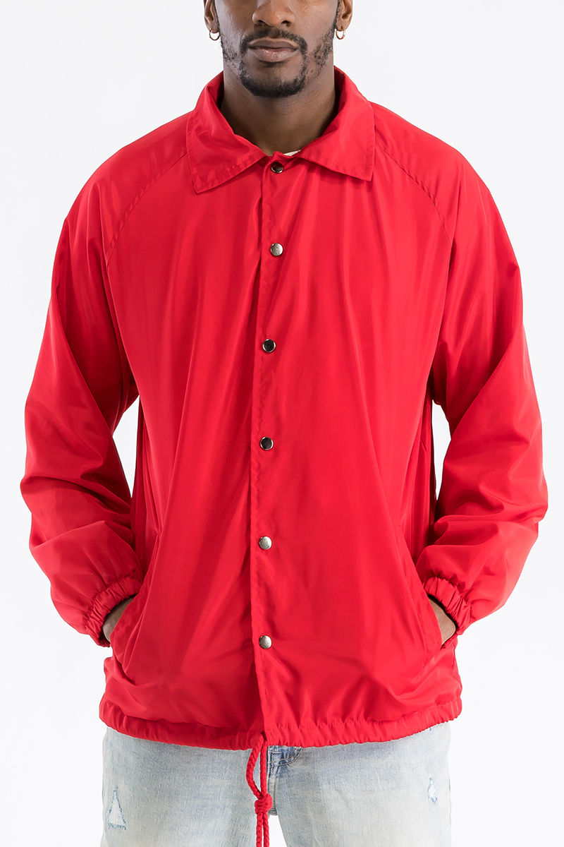 A stylish Solid Coachs Jacket in a sleek design, featuring a snap button closure and made from weather-resistant 100% polyester.