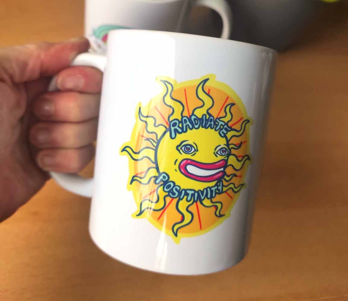 Our Ceramic Mug Radiate Positivity is printed on only the highest quality ceramic mugs. The vibrant design is not just a visual treat; it is also made to last. You can enjoy your favorite drinks without worrying about the print fading, even after multiple washes. This durability makes it an ideal choice for everyday use, whether at home or in the office.