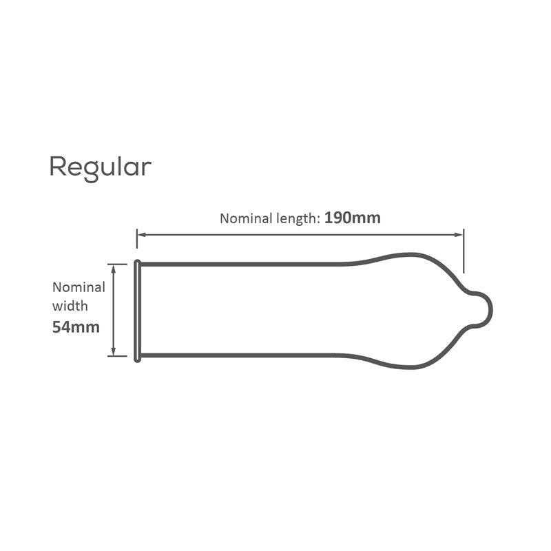 Pasante Regular condoms feature a contoured fit that adapts to the body's shape, ensuring maximum comfort during use. With a width of 54mm (2.1 inches) at the base and a length of 190±5mm (7.5 inches), these condoms are designed to fit most users comfortably. The smooth texture enhances the natural feeling, allowing for a more enjoyable experience.