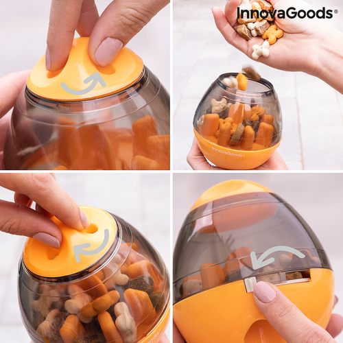 An original dispenser toy for pet treats, ideal for entertaining and training animals in a fun and enjoyable way. This multifunction pet toy helps to stimulate and develop the animal’s senses, promoting and facilitating their learning (looking for food, eating slowly, obtaining a reward for obeying, etc.). The foods and treats (small pieces of food, biscuits, titbits, etc.) are placed inside the toy, which is shaped like a maze to make it more challenging to get the treats out and therefore extend the time of play. It features a control to adjust the size of the contents outlet hole, enabling a greater or lesser quantity to be released as desired. The top lid has holes so the pets can smell the food and treats inside. Its balancing system always keeps the toy upright. The pet can play by moving it with their paws until the treat is released through the outlet hole. It also reduces the animal's anxiety, boosts their well-being and improves their eating habits, promoting a slow, non-gulping and healthier way of eating. The toy is made from shock and bite resistant materials. Its design and size stops the pet from being able to put it in their mouth and prevents choking. It can be dismantled easily for cleaning. Suitable for dogs and other small and medium sized pets.