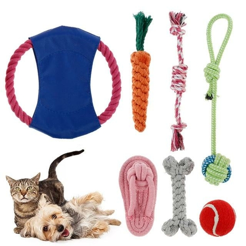 This toy kit includes seven different pieces, each crafted to provide unique play experiences. The set features chew toys that help clean your dog's teeth while they enjoy their playtime. The cotton rope ball is perfect for tug-of-war games, while the flying disc is ideal for outdoor fetch sessions. Each toy is designed to withstand the rigorous play of dogs of all sizes, from small to large breeds.