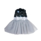 Glamorous party dress with lace and sequin top, bow with rhinestone buckle at waist, and layered tulle skirt. Velcro opening. 100% polyester. Black.