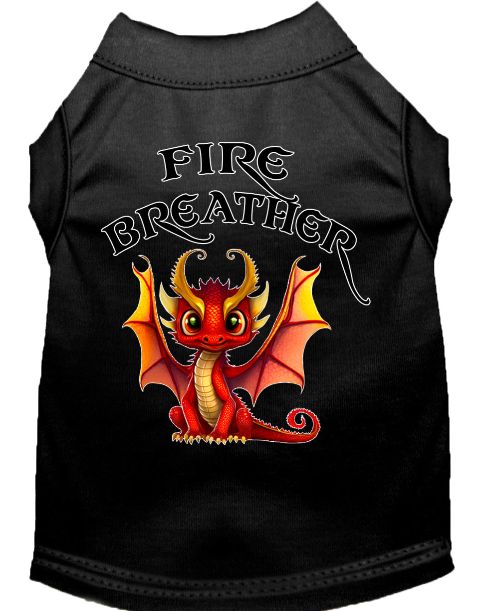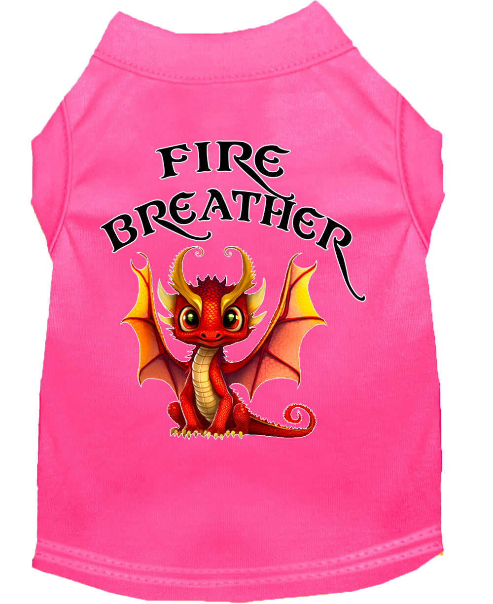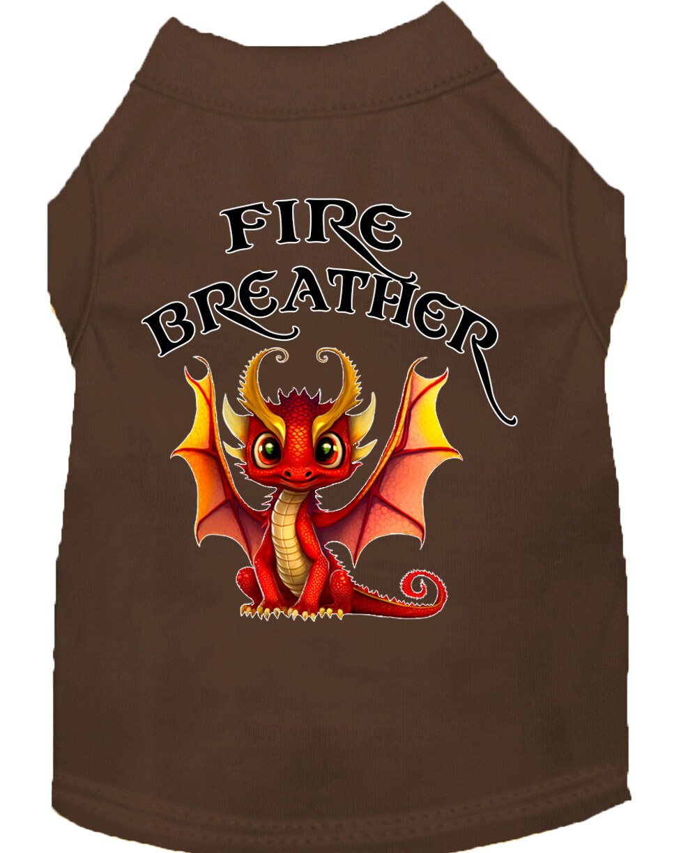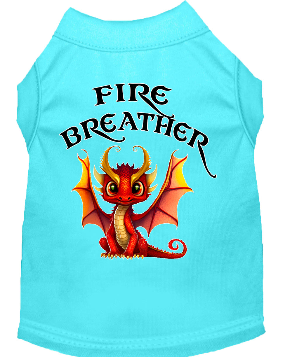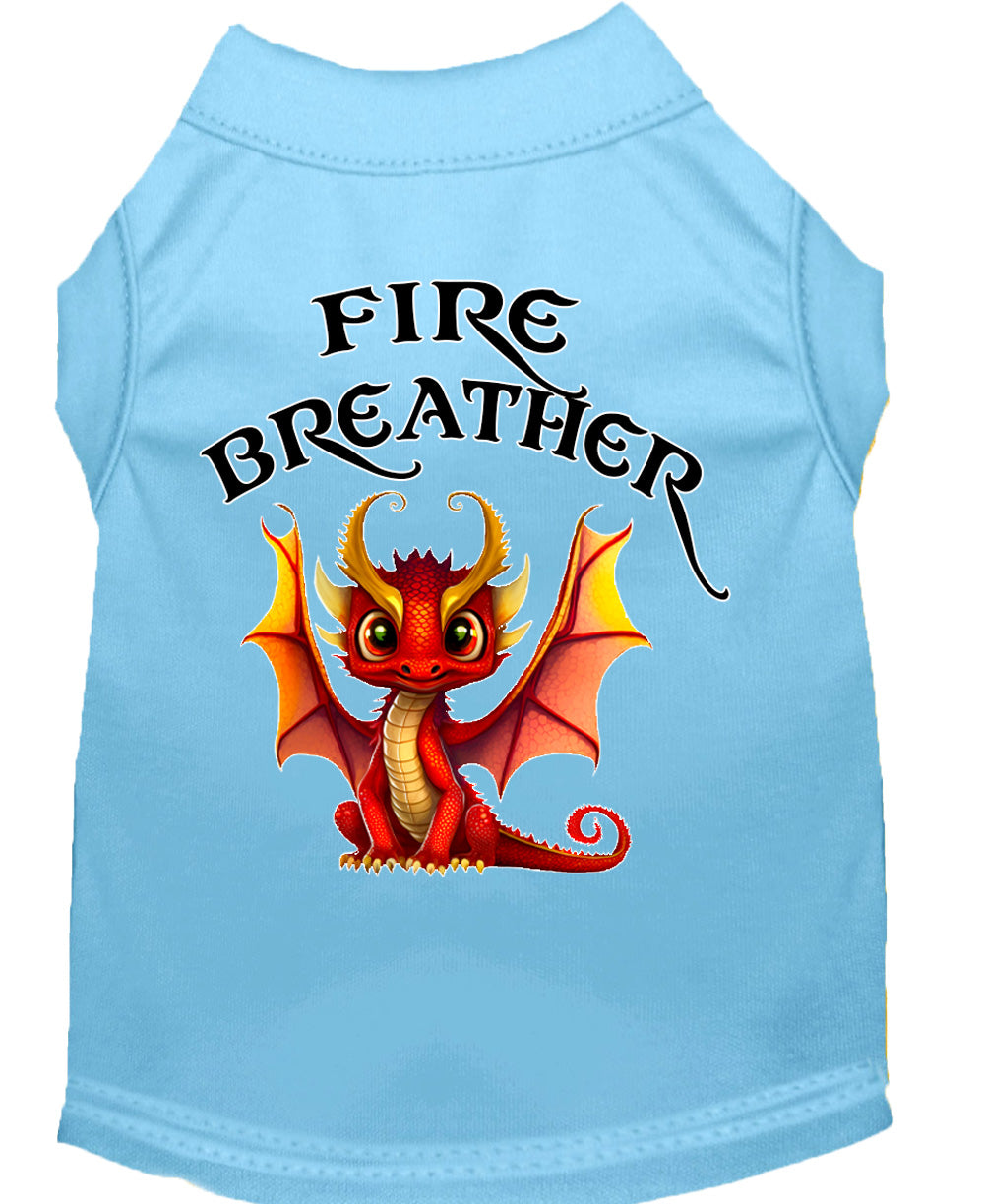 A soft and durable dog shirt featuring a vibrant Fire Breather Dragon design, suitable for pets weighing 20-115 pounds.
