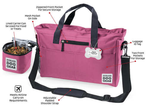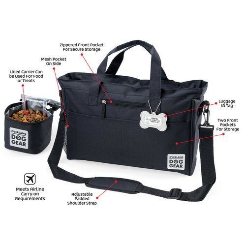 This highly functional dog luggage features: large main storage section, adjustable/removable padded shoulder strap, two front pockets for storage, zippered front pocket, top zip closure, mesh side pocket, and a back mesh storage pocket. Also included is a lined carrier that can hold up to 3 cups of food. Additionally, this travel bag meets most airline carry-on requirements, and features a luggage sleeve that fits over a suitcase pull up handle and a dog bone shaped ID luggage tag!