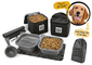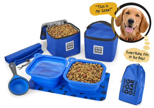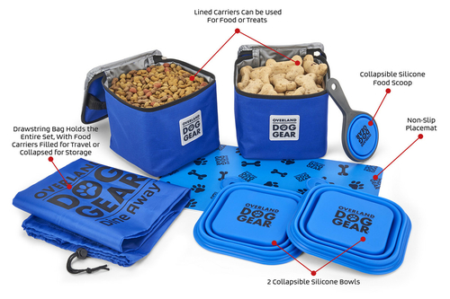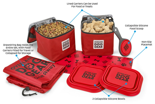 This dog food travel bag includes: Two lined carriers with handles which can be used to store food and/or treats, two collapsible silicone pet travel bowls, one collapsible silicone food scoop, a non-slip placemat, and a drawstring bag which holds the entire set. These dog food carriers can be filled with food while traveling, or collapsed for easy storage. The food carriers hold 30 cups total.