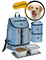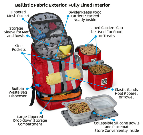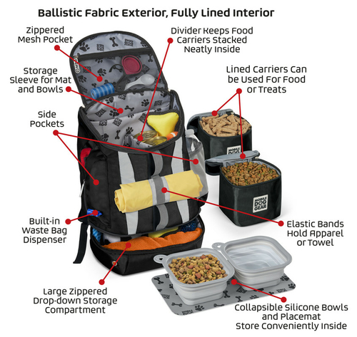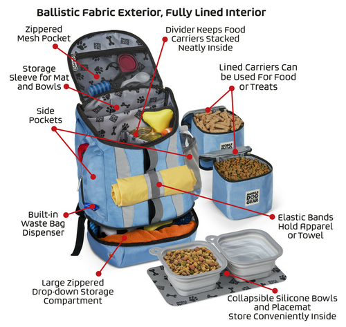This bag includes our MDG feeding system that consists of are 2 lined food carriers (30 cups total), placemat, and 2 collapsible silicone bowls that store conveniently in main section. This dog luggage features: large zippered drop-bottom section for extra storage, large main compartment, two padded backstraps, front daisy chain, side mesh pocket, side zippered fabric pocket, waste bag pocket and a front zippered pocket.