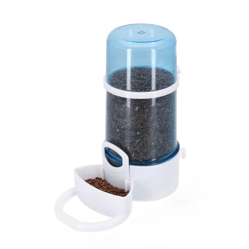 Pet Bird Drinker Feeder designed for small animals, featuring a blue and white automatic dispenser bottle with adjustable food output.