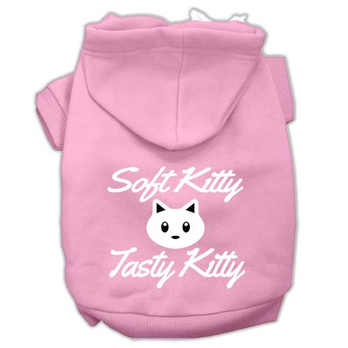 A cozy pet hoodie for dogs and cats, featuring the screen printed phrase 'Soft Kitty, Tasty Kitty', made from soft cotton and polyester blend.