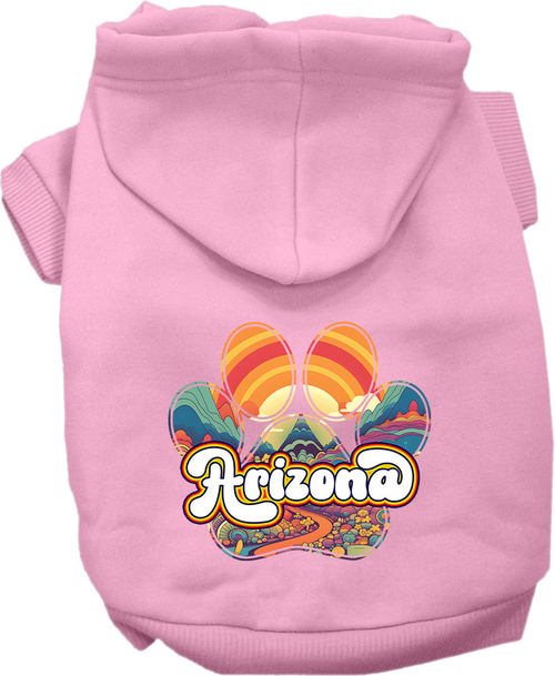 Introducing the Pet Dog & Cat Screen Printed Hoodie for Small to Medium Pets, featuring the stylish "Arizona Groovy Summit" design. This hoodie is perfect for keeping your furry friends warm and comfortable during chilly days. Made from a high-quality blend of 65% cotton and 35% polyester, this hoodie offers the ideal combination of softness and durability, ensuring that your pet stays cozy while looking fashionable.