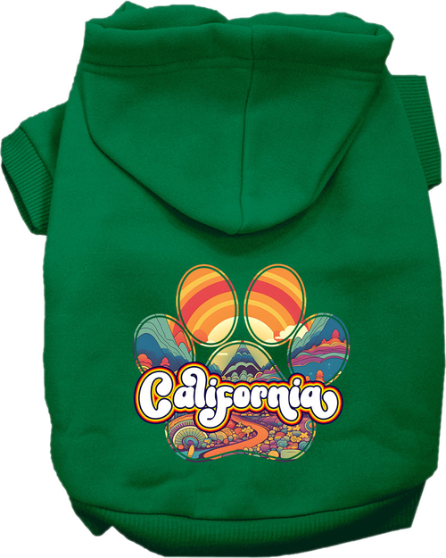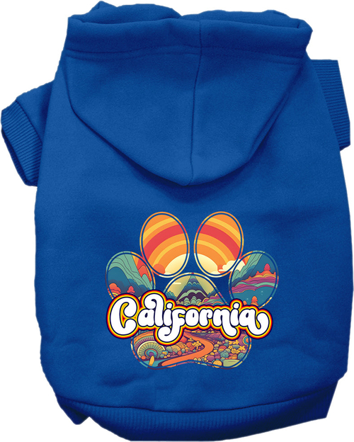 A small to medium pet wearing a California Groovy Summit screen printed hoodie, showcasing its soft fabric and stylish design.