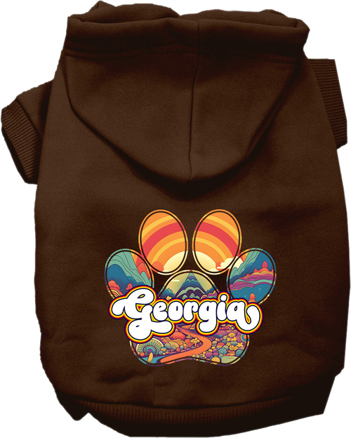 Introducing our Pet Dog & Cat Screen Printed Hoodie for Small to Medium Pets, available in sizes XS to XL. This stylish hoodie features a unique design called "Georgia Groovy Summit" that will make your furry friend stand out during walks or playtime. Made from a comfortable blend of 65% cotton and 35% polyester, this hoodie is perfect for keeping your pet warm and cozy.