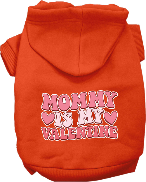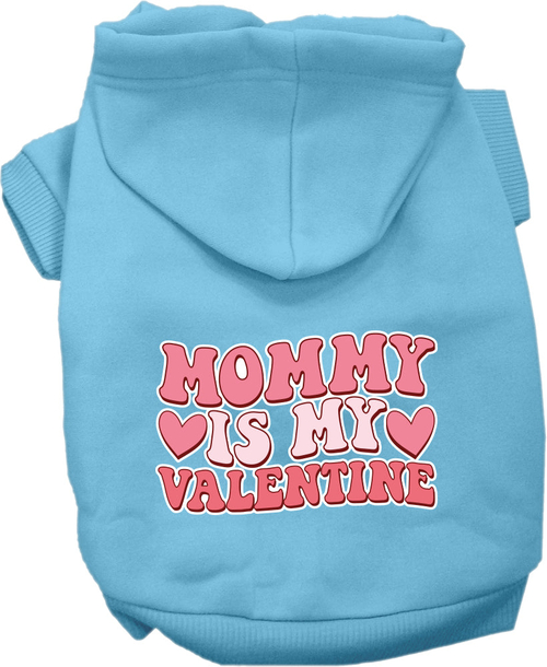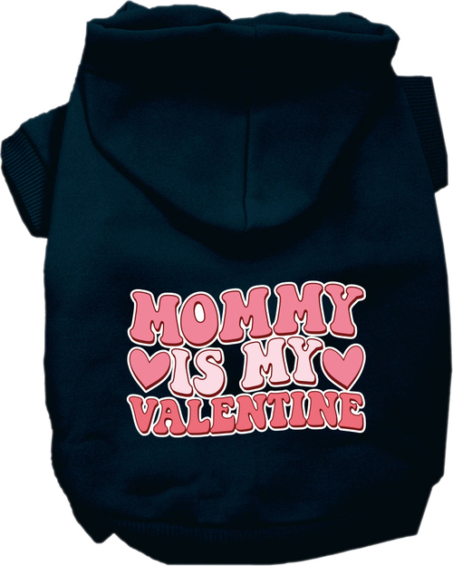 A cozy pet hoodie for dogs and cats, featuring the text 'Mommy Is My Valentine' in a stylish screen print, perfect for small to medium pets.