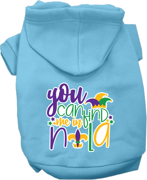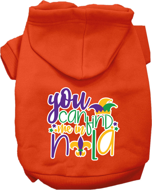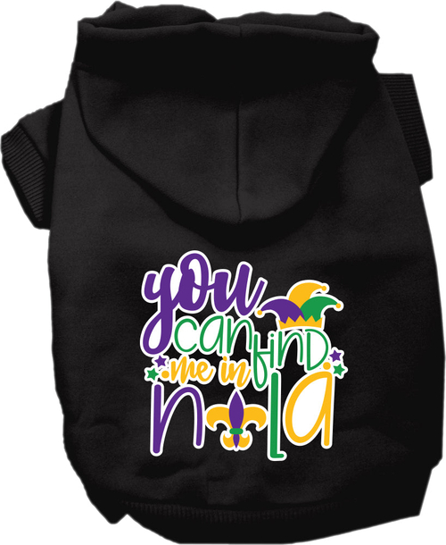 A cozy screen printed hoodie for small to medium pets, featuring the phrase 'You Can Find Me In Nola', designed for comfort and durability.