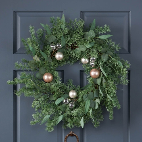 From its natural-looking greenery to its delightful silver ornaments, our wreath perfectly captures a winter charm for your interior space.