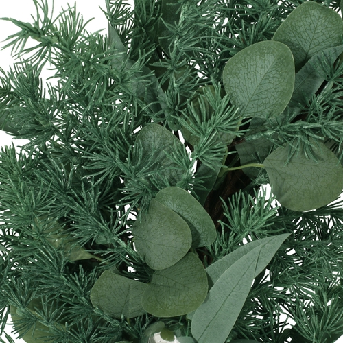 With an unbeatable combination of pine needles with eucalyptus and olive leaves and dazzling silver ornaments, this accessory will be sure to enliven any space.