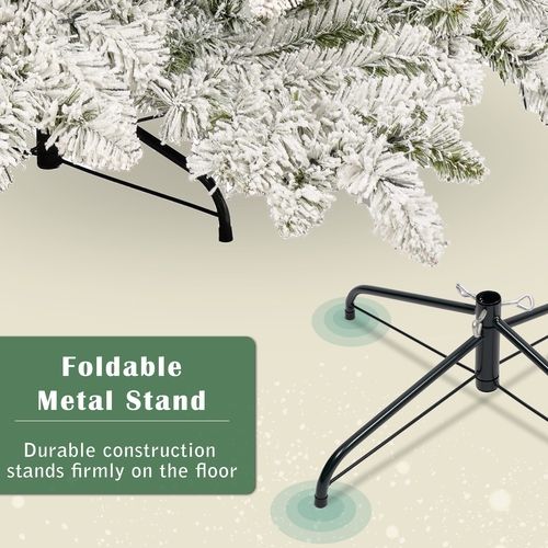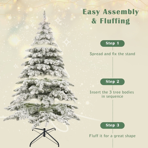 Create a winter Christmas scene with this Artificial Christmas Tree boasting soft looking foliage flocked with a snow-like effect throughout 1050 bendable branches for accenting with holiday accents. Pre-strung with 400 LED lights and stabilized on a Metal Stand, this impressive 7.5ft. tall artificial Christmas tree will ensure your home is always picture-perfect throughout the holidays. Full Christmas tree features super easy assembly in 3 steps: simply connect the tree sections to the base and fluff the branches. Durable construction with metal base stands firmly on the floor. When January rolls around, you can easily pack the tree back into box ready for next Christmas, and many more after that. You can customize your Christmas tree with garlands, lights, ornaments and more to highlight different areas of your living space, office or even holiday parties! We believe that special holiday memories don't have to be far and few between. This Christmas season, let our decorations transform your home while you focus on creating more of those magical moments. And our Christmas tree has a stable base that provides stability: The sturdy tree stand of our decorated pine tree provides stability, allowing your tree to stand throughout the seasons and allowing your tree to stand for years to come.