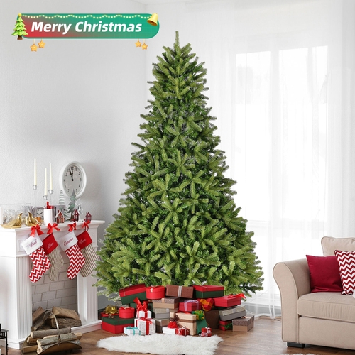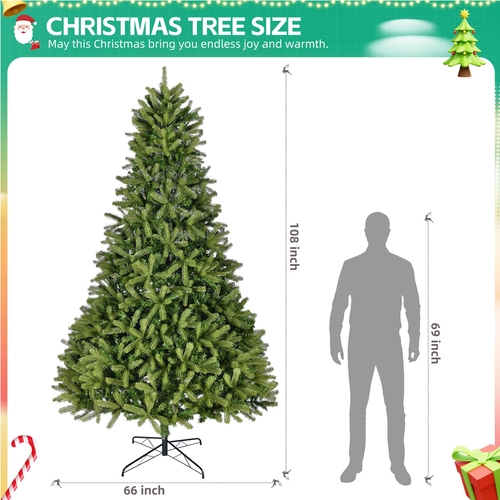 - Realistic & Vivid Design: This artificial 9 foot tree contains 2576 individual branches tips. Fluffy and thick branches, bright color, make the Christmas tree as lifelike as a real pine tree. Perfectly capture the ambiance of the wintry forests in your home, add a cheerful festive atmosphere to you. A big hit in Christmas home decoration!