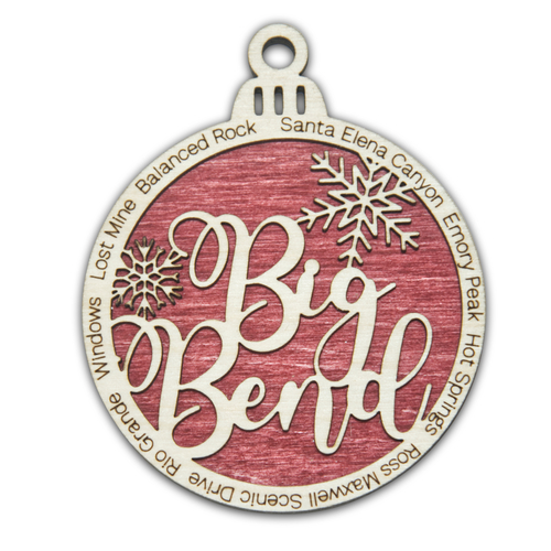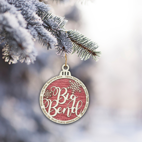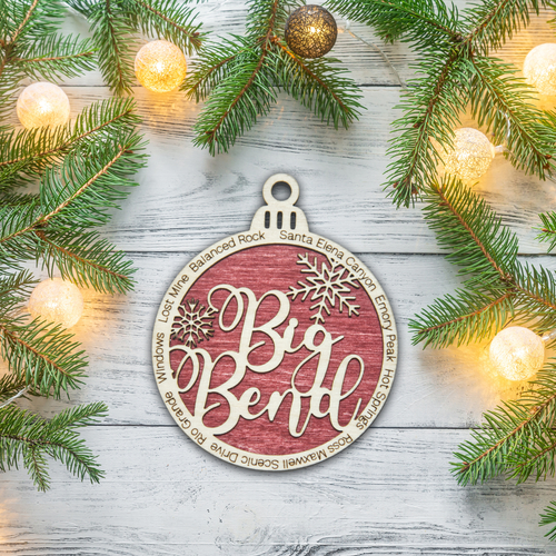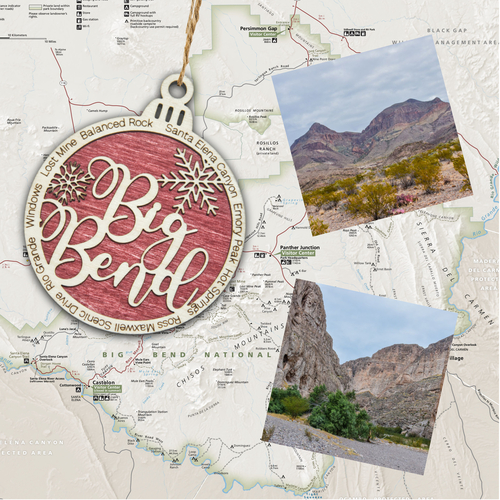Each ornament features Big Bend in the center and the outer ring features 8 Big Bend landmarks. The featured landmarks are Santa Elena Canyon, Emory Peak, Hot Springs, Ross Maxwell Scenic Drive, Rio Grande, Windows, Lost Mine, and Balanced Rock.