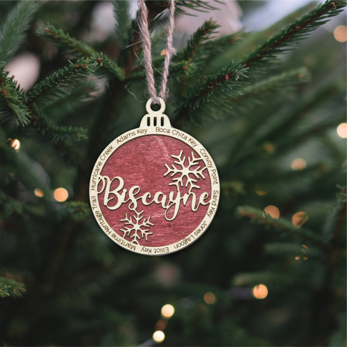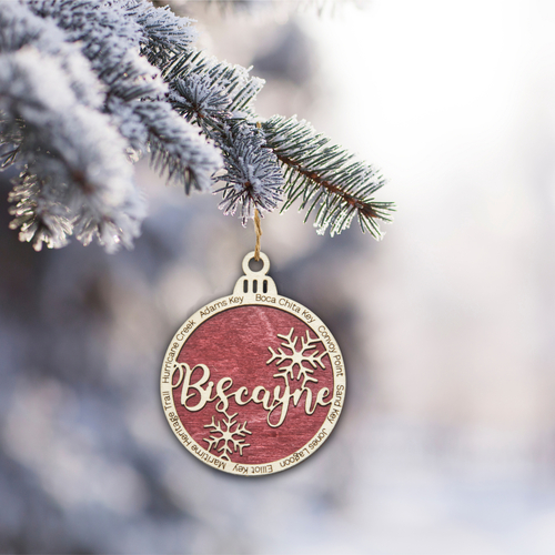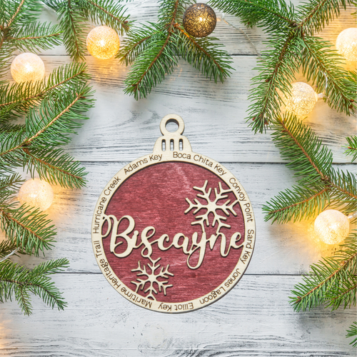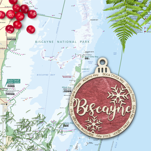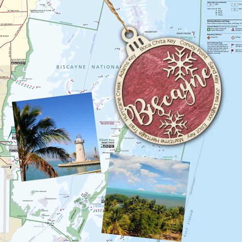 Each ornament features Biscayne in the center and the outer ring features 8 Biscayne landmarks. The featured landmarks are Boca Chita Key, Convoy Point, Sand Key, Jones Lagoon, Elliot Key, Maritime Heritage Trail, Hurricane Creek, Adams Key.