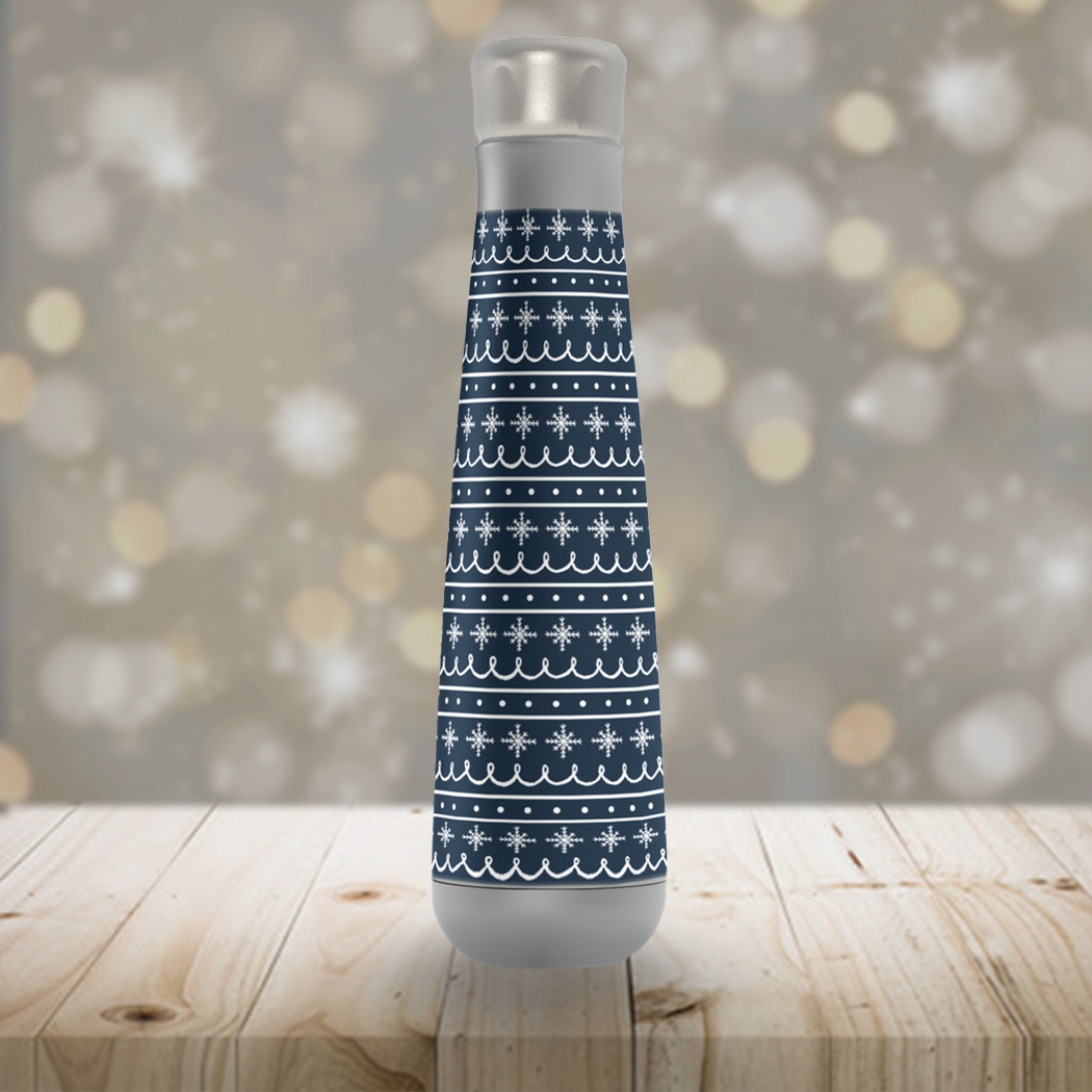 Blue Snowflake Pattern Peristyle Water Bottle made of stainless steel, featuring a screw-on lid and vacuum insulation, ideal for keeping drinks cold or hot.