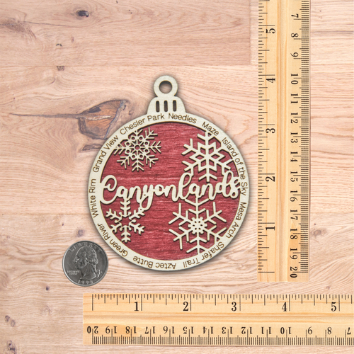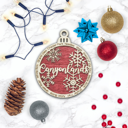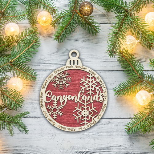 Each ornament features Canyonlands in the center and the outer ring features 10 Canyonlands landmarks. The featured landmarks are Needles, Maze, Island of the Sky, Mesa Arch, Shafer Trail, Aztec Butte, Green River, White Rim, Grand View, Chesler Park