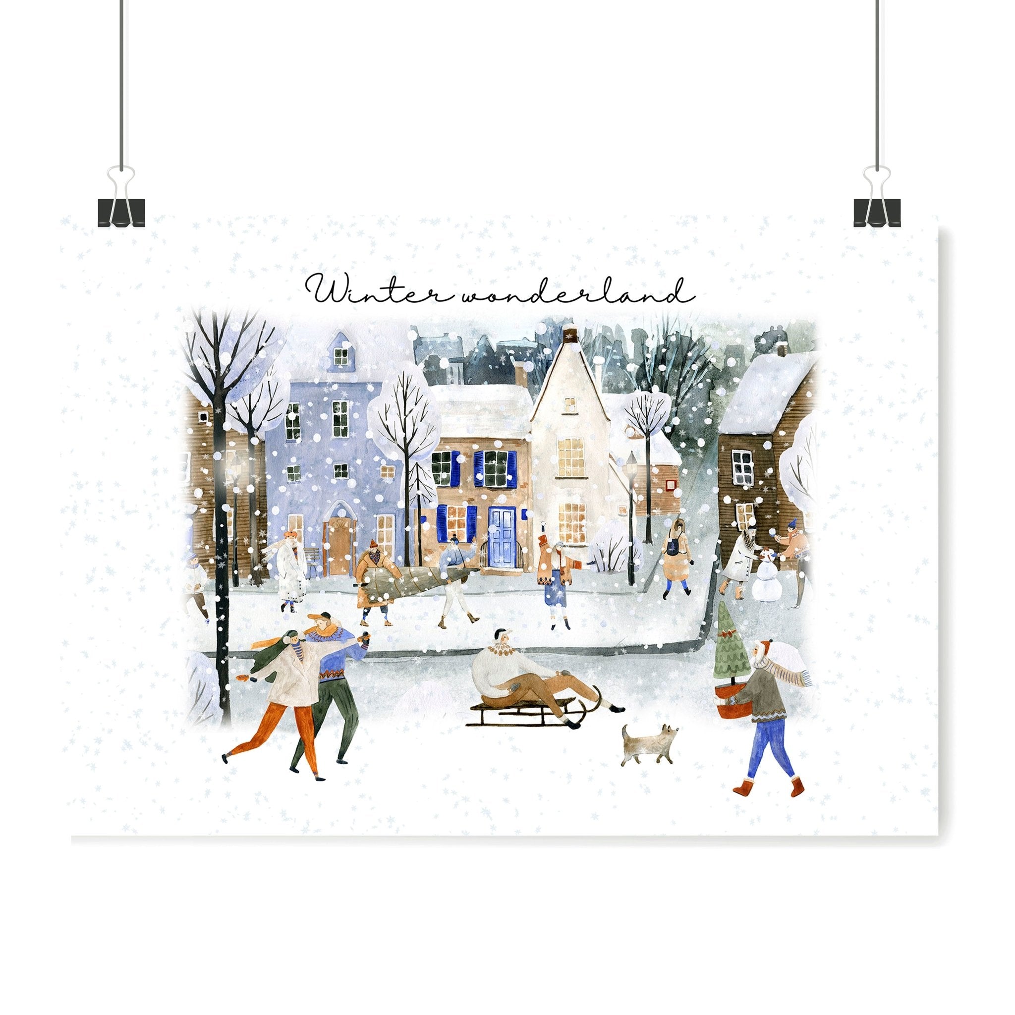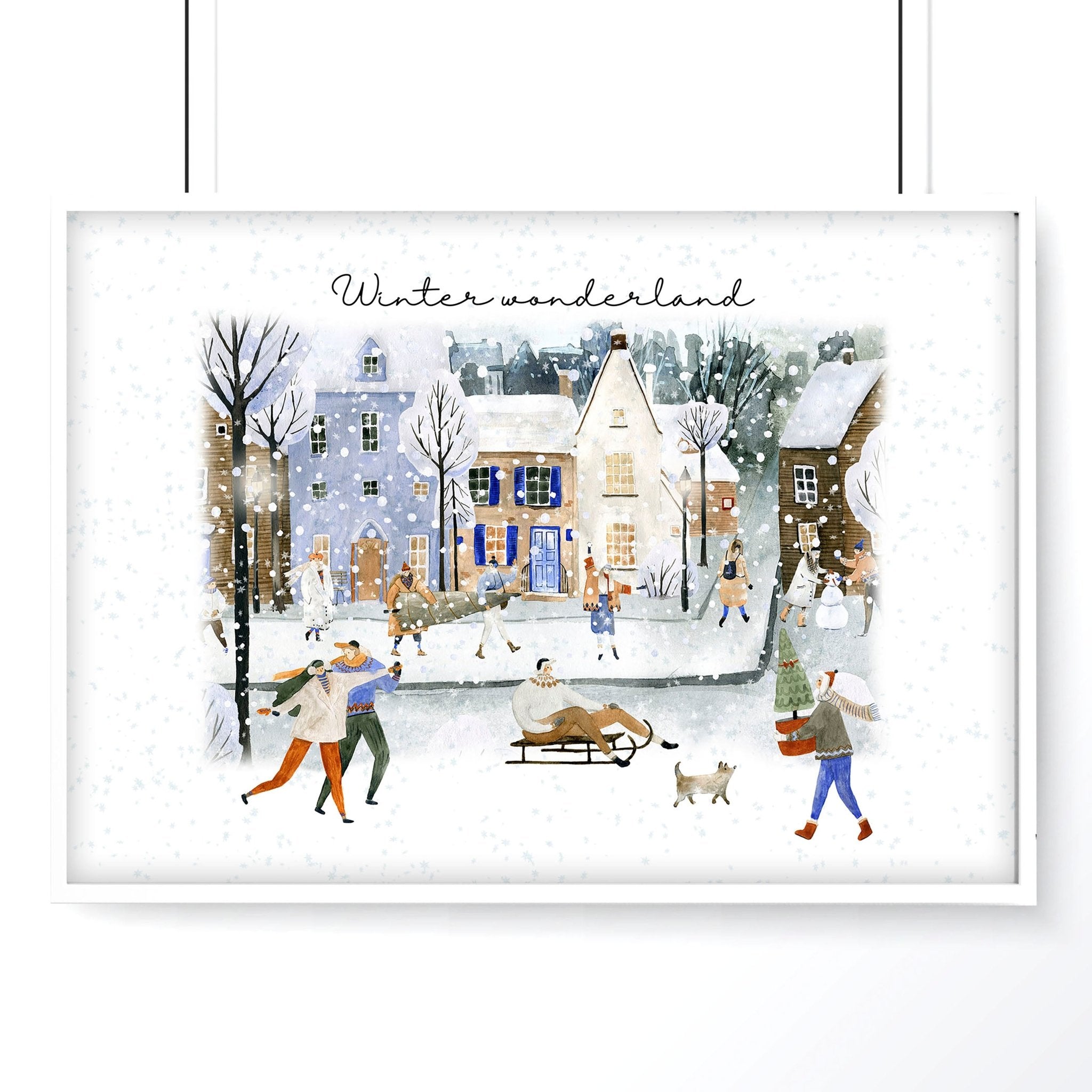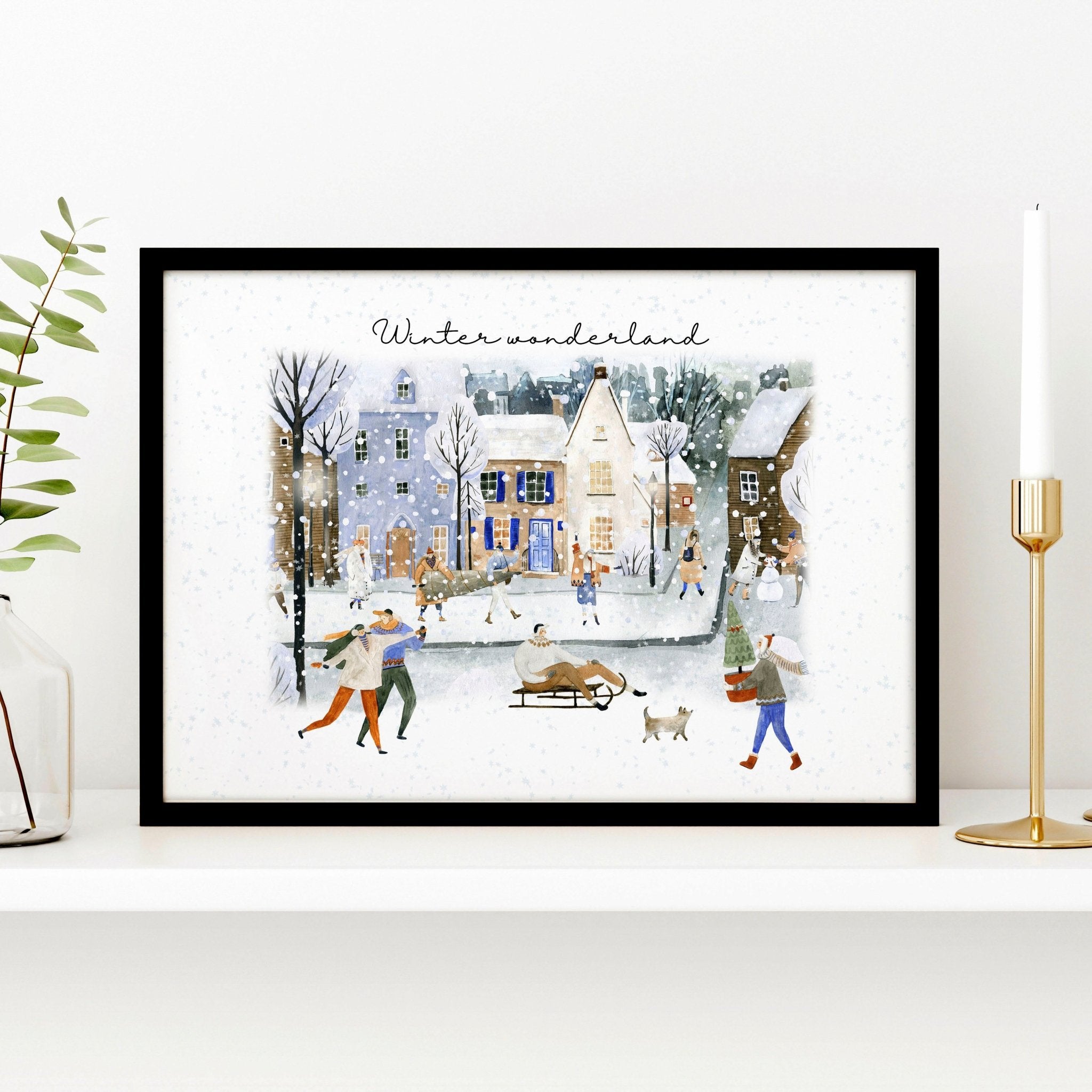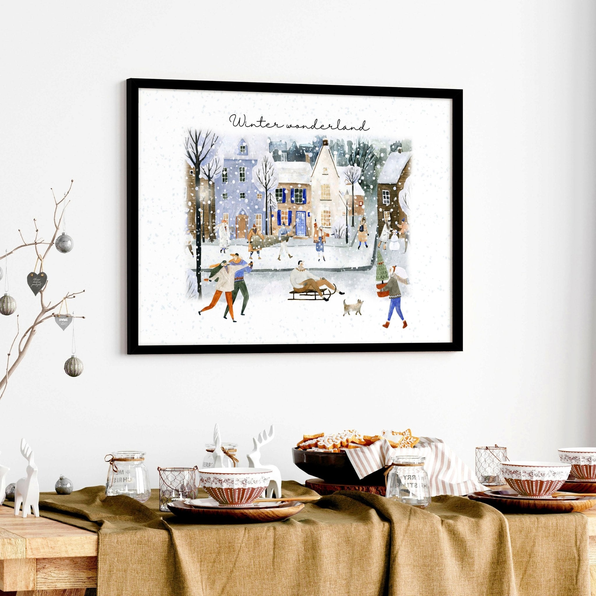 Elevate your home decor this festive season with our stunning Large Christmas decoration wall art print. This captivating piece features a beautiful watercolour illustration of a snowy Scandinavian Christmas village, immersing you in the charm and joy of the holiday season. As you gaze upon the enchanting scene of people joyfully skating on an iced pond, you'll feel the warmth and magic of Christmas come alive in your space.