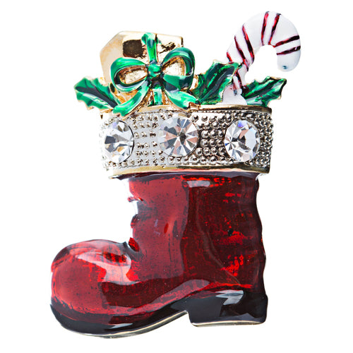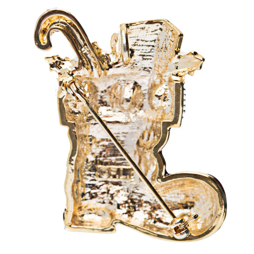 The design of this brooch showcases a whimsical boot filled with presents, symbolizing the joy of giving and receiving during the holidays. The gold tone finish adds a touch of elegance, while the clear crystals catch the light beautifully, making this piece a standout accessory. Measuring approximately 1.75 inches in length and 1.25 inches in width, it is the perfect size to adorn your coat, scarf, or sweater.