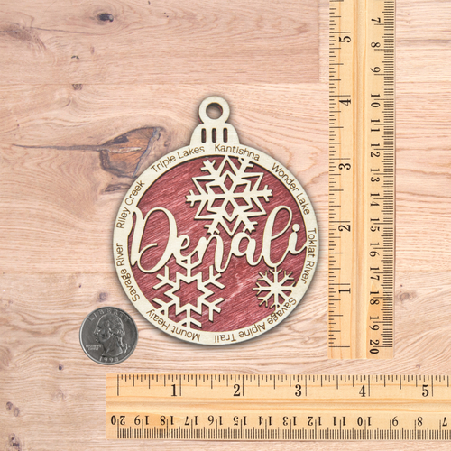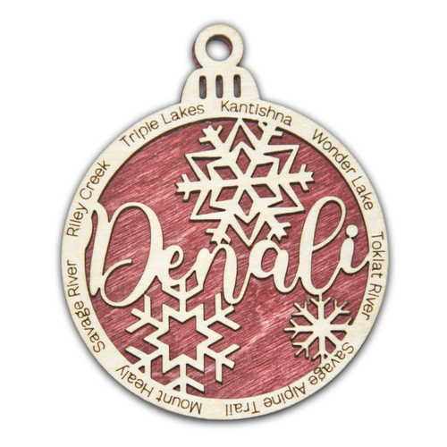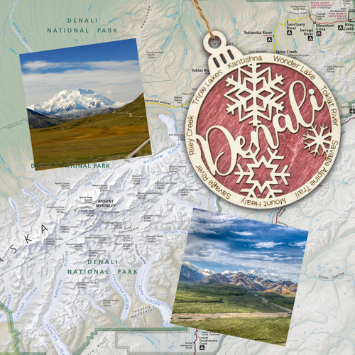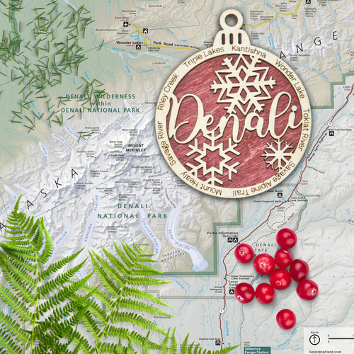 Each ornament features Denali in the center and the outer ring features 8 Denali landmarks. The featured landmarks are Kantishna, Wonder Lake, Toklat River, Savage Alpine Trail, Mount Healy, Savage River, Riley Creek, and Triple Lakes.