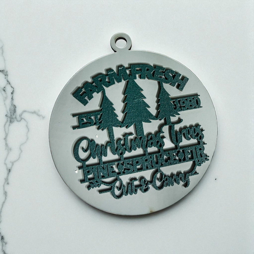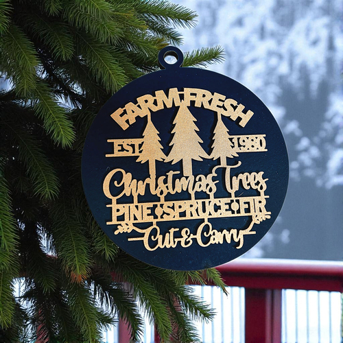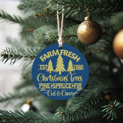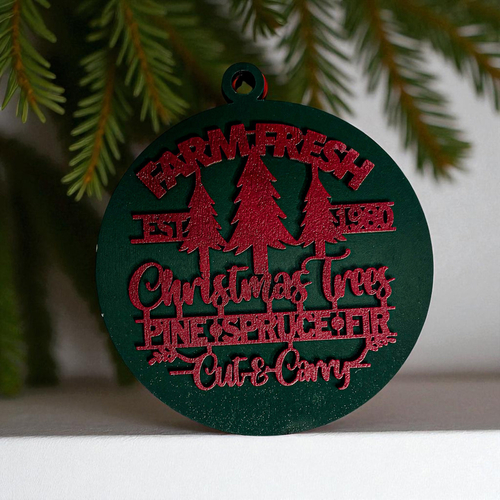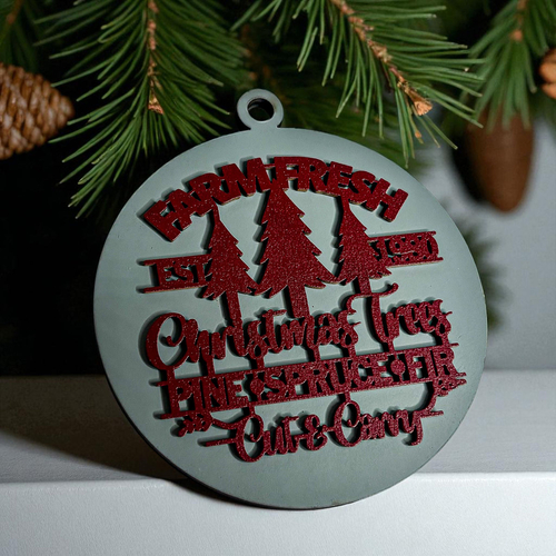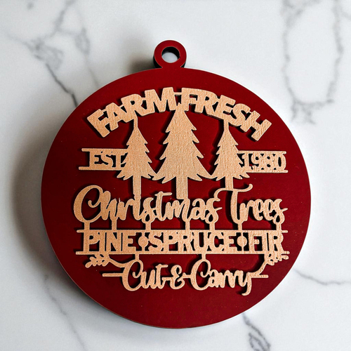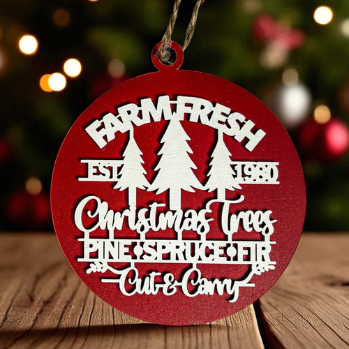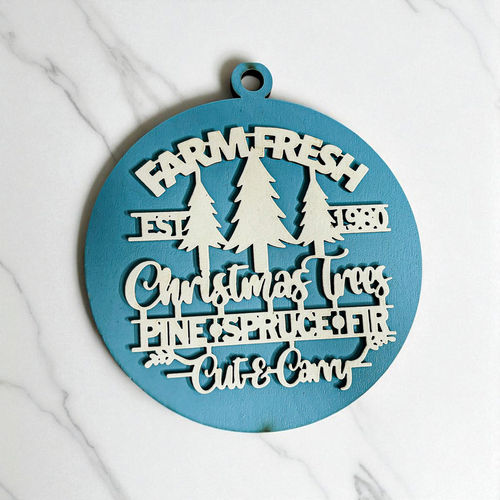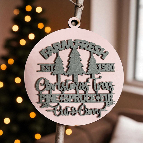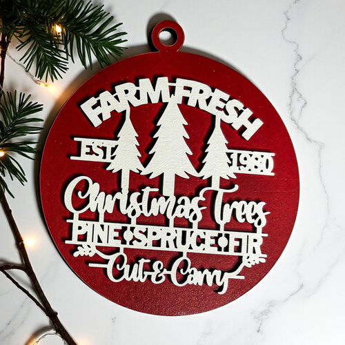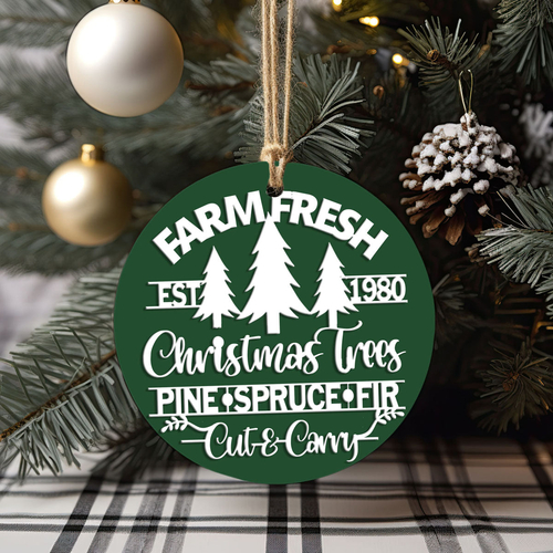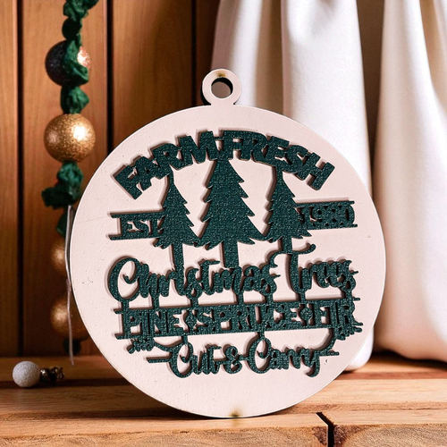 Bring the warmth and nostalgia of a classic Christmas tree farm into your home with our Farm Fresh 12 Colors Wooden Ornament. This delightful ornament features the phrase "Est. 1980" along with a trio of beautifully crafted Christmas trees—pine, spruce, and fir—perfectly capturing the essence of the holiday season. The charming design is enhanced by a 3D effect that makes it a standout piece on your tree, mantle, or anywhere you wish to add a touch of rustic elegance.