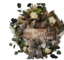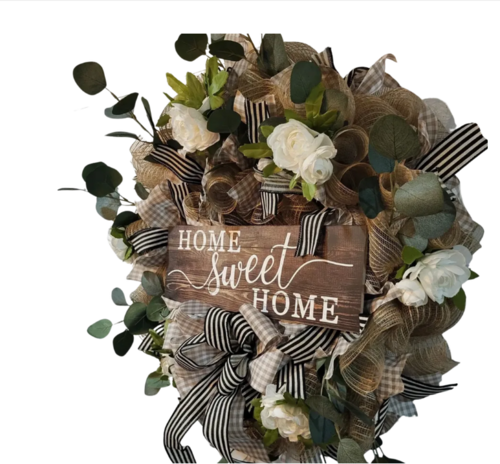 This beautiful every wreath is perfect to hang on your door, in your kitchen or any room in your home or office. It is made with burlap, white and tan mesh, tan and white gingham ribbon and white and black stripe ribbon. The sign reads Home Sweet Home. There are faux eucalyptus and white roses placed throughout the wreath. The wreath measures approximately 26x26x8. Each wreath is individually handmade and may differ slightly.