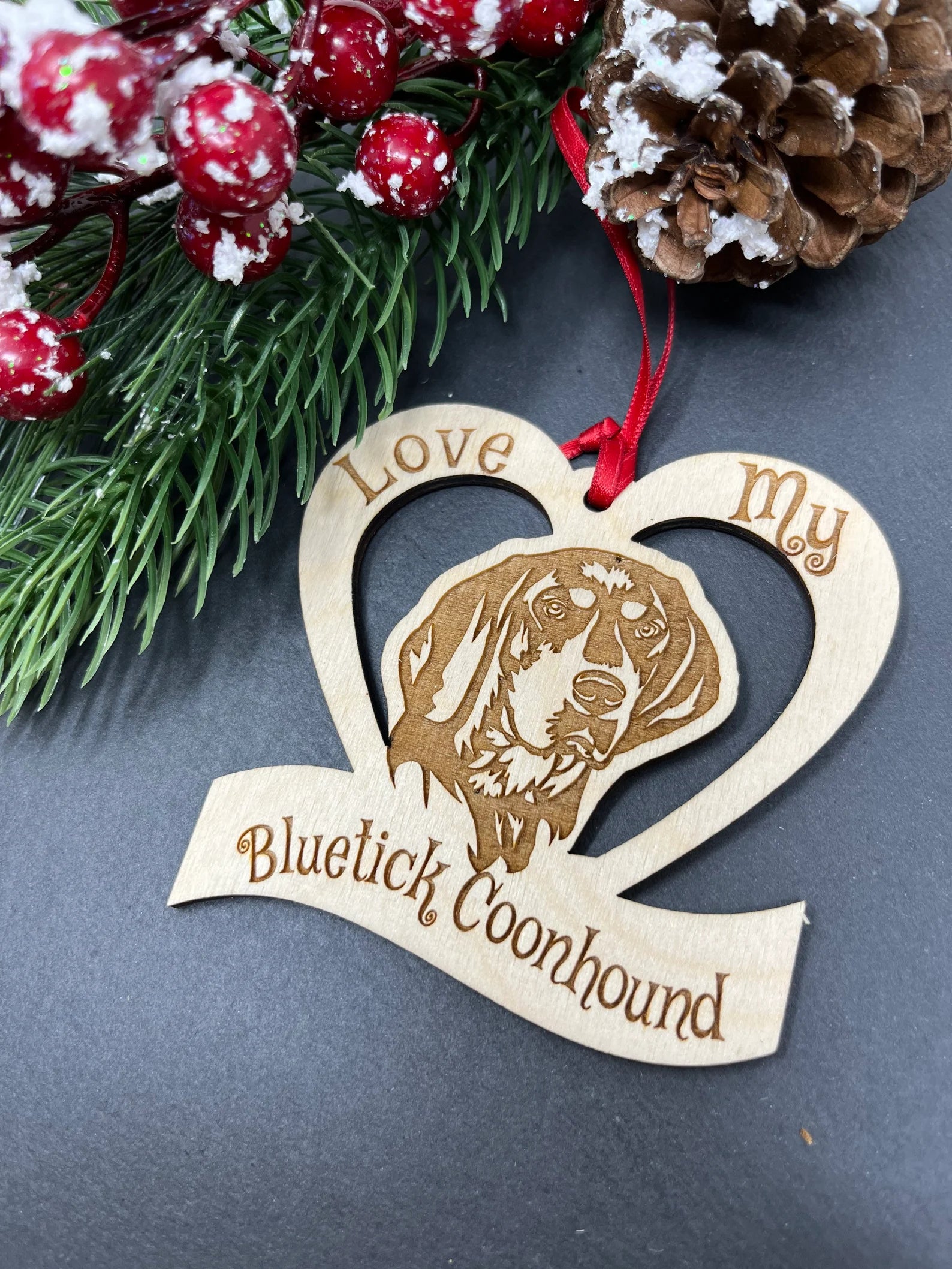 Introducing the Love My Bluetick Coonhound ornament, a delightful way to celebrate your beloved furry friend. This beautifully crafted ornament is not just a decoration; it's a heartfelt tribute to the special bond between you and your dog. Perfect for dog owners, this ornament serves as a reminder of the joy and companionship that our pets bring into our lives.