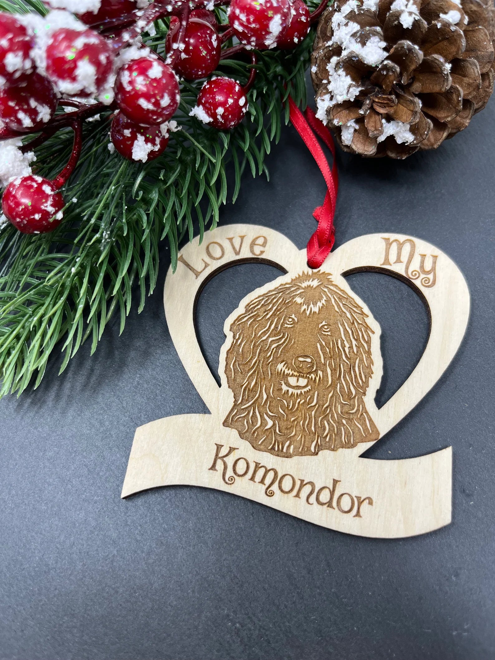The Love My Komondor ornament features a stunning laser-engraved design that captures the essence of this unique breed. Each ornament is made from high-quality 1/8" Baltic Birch wood, ensuring durability and a beautiful finish. The intricate details of the engraving highlight the distinctive characteristics of the Komondor, making it a standout piece on any Christmas tree or wall display.