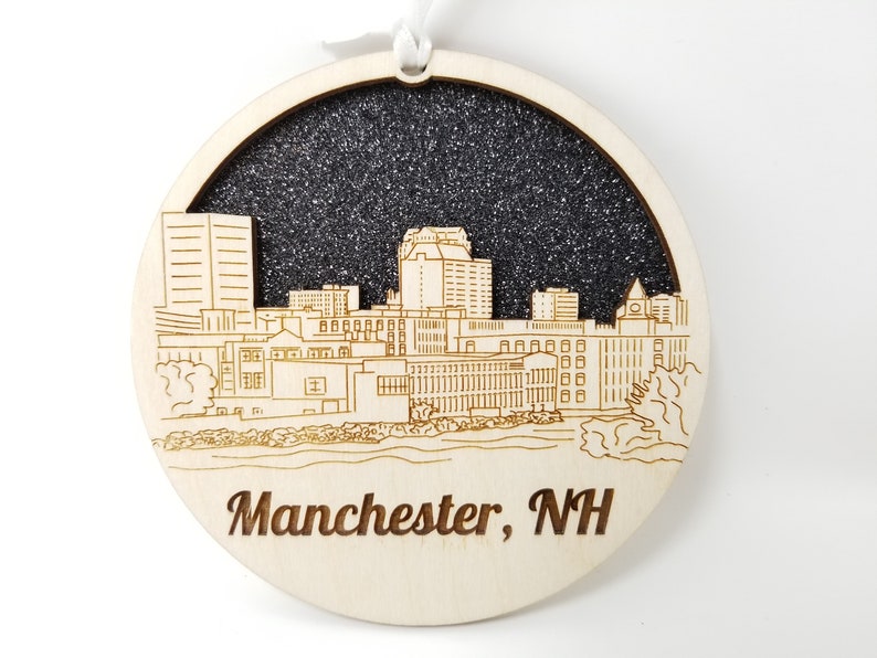 Measuring approximately 4 inches, this ornament is the ideal size for hanging on your Christmas tree or displaying on a shelf. Its compact design allows it to fit seamlessly into your holiday decorations without overwhelming other ornaments. The Manchester Skyline Ornament is a perfect blend of elegance and simplicity, making it a must-have for any Manchester enthusiast.