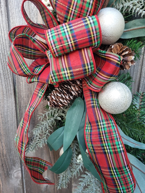 Add a touch of natural beauty to your home with our Mixed Greenery Wreath. This wreath is approximately 24 inches in diameter. It has a touch of faux eucalyptus, cedar and pine cones. It is completed with a red plaid tartan bow.