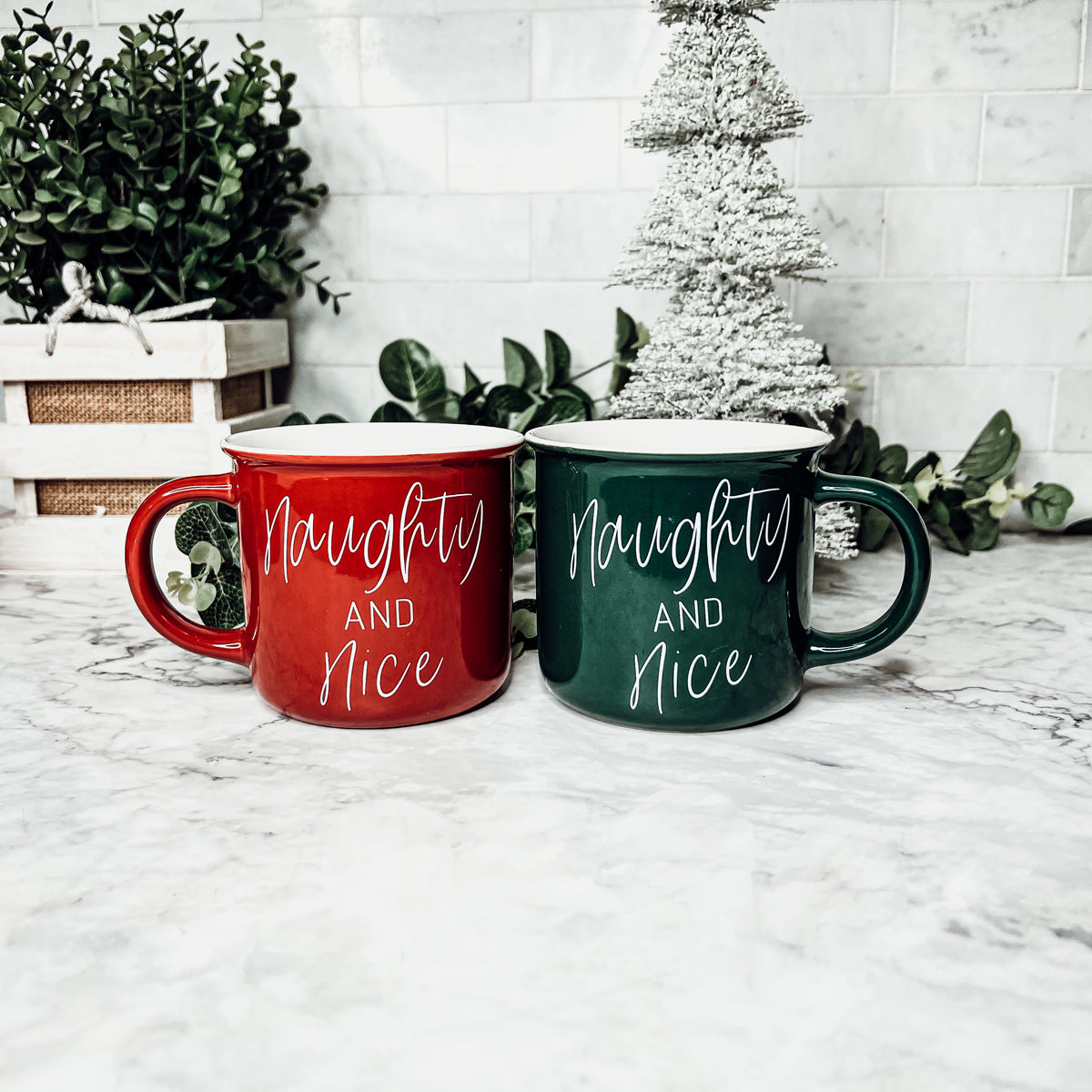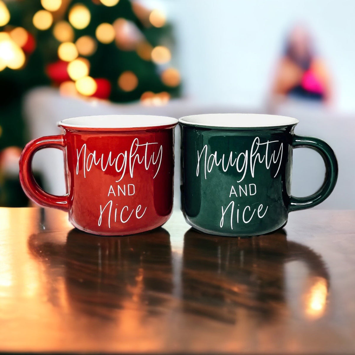 This ceramic campfire style mug holds 14.5oz of your favorite beverage, whether it's coffee, tea, or hot chocolate. Its dimensions are 4 inches in top diameter, 3.5 inches in height, and 3 inches in bottom diameter, making it a comfortable fit for your hands. The Naughty & Nice Mug is available in two eye-catching colors: red and green, allowing you to choose the one that best fits your personality or kitchen decor.