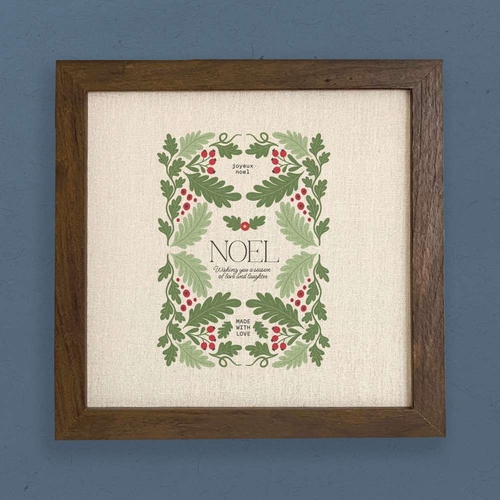 Noel Framed Sign with a stylized wood frame, featuring eco-friendly ink printing on a linen-look background, perfect for holiday decor.