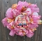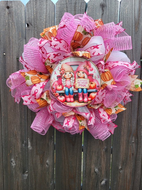 Show your support for Breast Cancer Awareness with this beautiful Deco Mesh Wreath. Perfect for hanging on your door or wall, we all wear pink to show our support. This wreath is made of pink and white deco mesh, pink awareness ribbon, pumpkin ribbon, and a sign with 2 ladies in the back of a pink truck holding a sign that reads In October we wear pink. The sign is made of MDF. The wreath measures approximately 17x18x7.