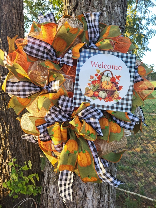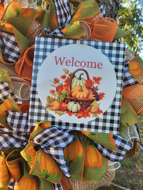 This handmade fall wreath will add to your traditional fall decor this season. This wreath is made of tan, cream, and orange deco mesh, black and white check ribbon, green with orange pumpkin ribbon and a handmade aluminum 8x8 square sign that has a basket of pumpkins with black and white border. The wreath measures approximately 21x21x6. Each wreath is individually handmade.