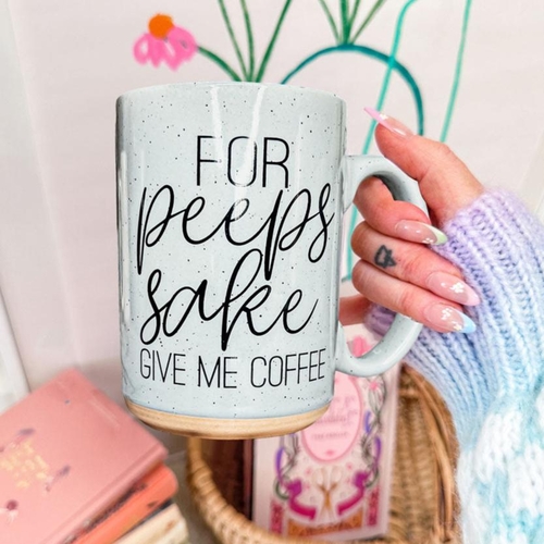Introducing the For Peeps Sake mug, a delightful addition to your morning routine that combines functionality with a playful design. This ceramic masterpiece is not just a vessel for your coffee; it's a statement piece that embodies your love for caffeine and adds a touch of sass to your day. With a generous capacity of over 16 ounces, this mug is perfect for those who enjoy a hearty serving of their favorite brew, whether it's coffee, tea, or any other beverage of choice. The mug features the cheeky phrase 'For Peep's Sake, Give Me Coffee' printed on both sides, ensuring that your plea for caffeine is visible from any angle. Crafted from high-quality double wall ceramic, this mug is designed to keep your drinks hot while remaining comfortable to hold. The pastel color options—soft blue and pink—add a charming aesthetic that complements any kitchen decor. The interior of the mug is also colored, enhancing its visual appeal and making it a joy to use every day. Light speckles throughout the ceramic give it a unique texture, while the black hand-styled Gia Roma graphic adds an artistic touch that sets it apart from ordinary mugs. This mug is not just about looks; it's built for everyday use. It's microwave and dishwasher safe, making it convenient for busy mornings when you need your coffee fix quickly. Just remember to wash it before use and avoid abrasive cloths when cleaning to maintain its pristine condition. When removing the mug from the microwave, exercise caution to prevent burns. The For Peeps Sake mug is more than just a coffee cup; it's a mood booster that transforms your morning routine into a delightful experience. Whether you're sipping your favorite beverage at home, in the office, or gifting it to a friend, this mug is sure to bring a smile to anyone's face. It's perfect for Easter celebrations or any occasion where you want to add a bit of fun to your drinkware collection. So why wait? Grab your For Peeps Sake mug today and make your mornings a whole lot sweeter. With its playful design and practical features, it's the perfect companion for anyone who loves coffee and appreciates a good laugh. Start your day right with a mug that not only holds your drink but also expresses your personality and love for caffeine. Don't miss out on this charming addition to your kitchen; order yours now and enjoy the perfect blend of style and functionality.