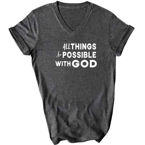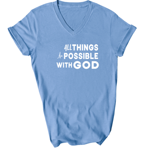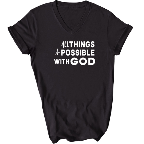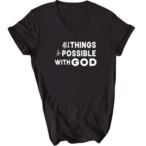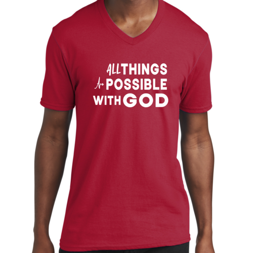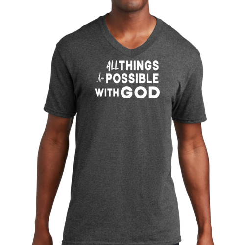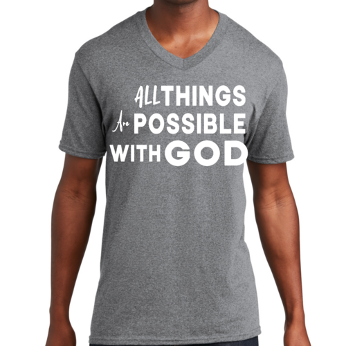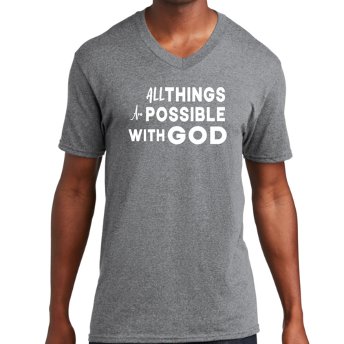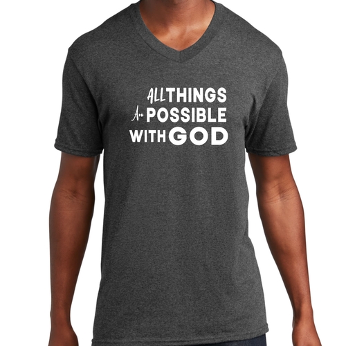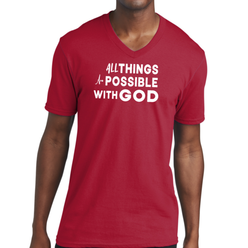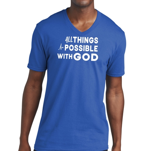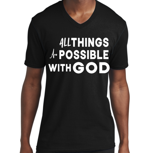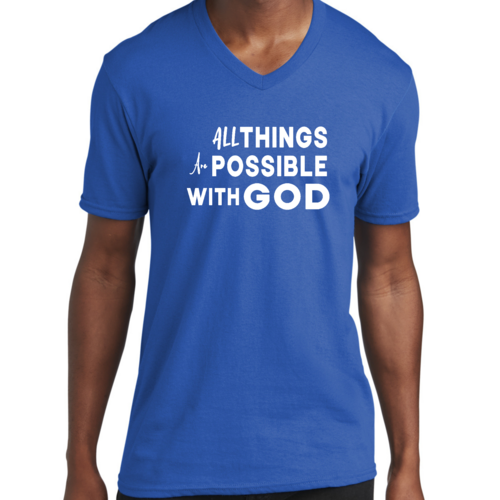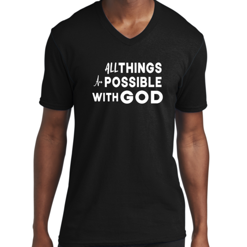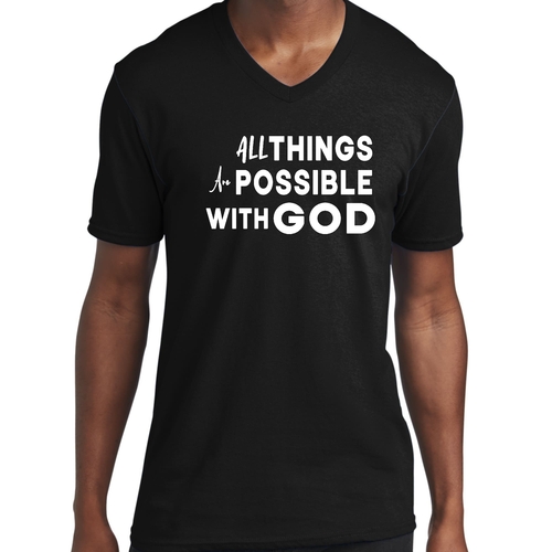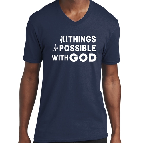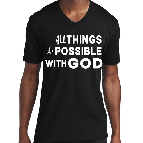 In summary, our Men's Graphic V-neck T-shirt featuring 'All Things Are Possible With God' is a must-have for anyone looking to combine comfort, style, and a positive message. With its soft preshrunk cotton fabric, classic fit, and durable construction, this T-shirt is designed to be a staple in your wardrobe. Don't miss out on the opportunity to express your faith and style with this unique and meaningful T-shirt.