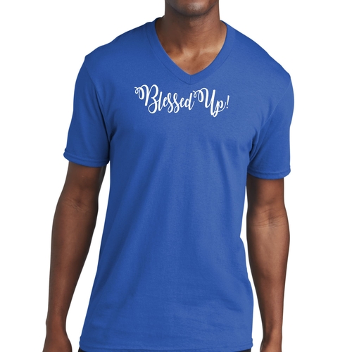 Available in a range of sizes, the Blessed Up Men's Graphic V-neck T-shirt caters to a wide audience. Whether you prefer a snug fit or a looser style, you can find the perfect size that suits your preference. The timeless design ensures that it can be paired with jeans, shorts, or even joggers, making it a staple in your casual wear collection.