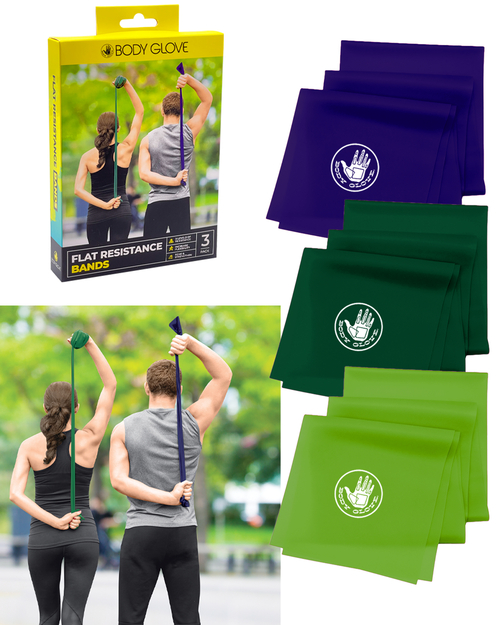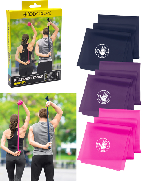 Body Glove Flat Resistance Bands are a compact, lightweight, and portable way to increase range of motion, deepen stretching, and improve flexibility while simultaneously building muscke and increasing bone strength. Use these multitasking bands individually or together to add resistance and/or assist your progress in a wide variety of no-impact workouts.