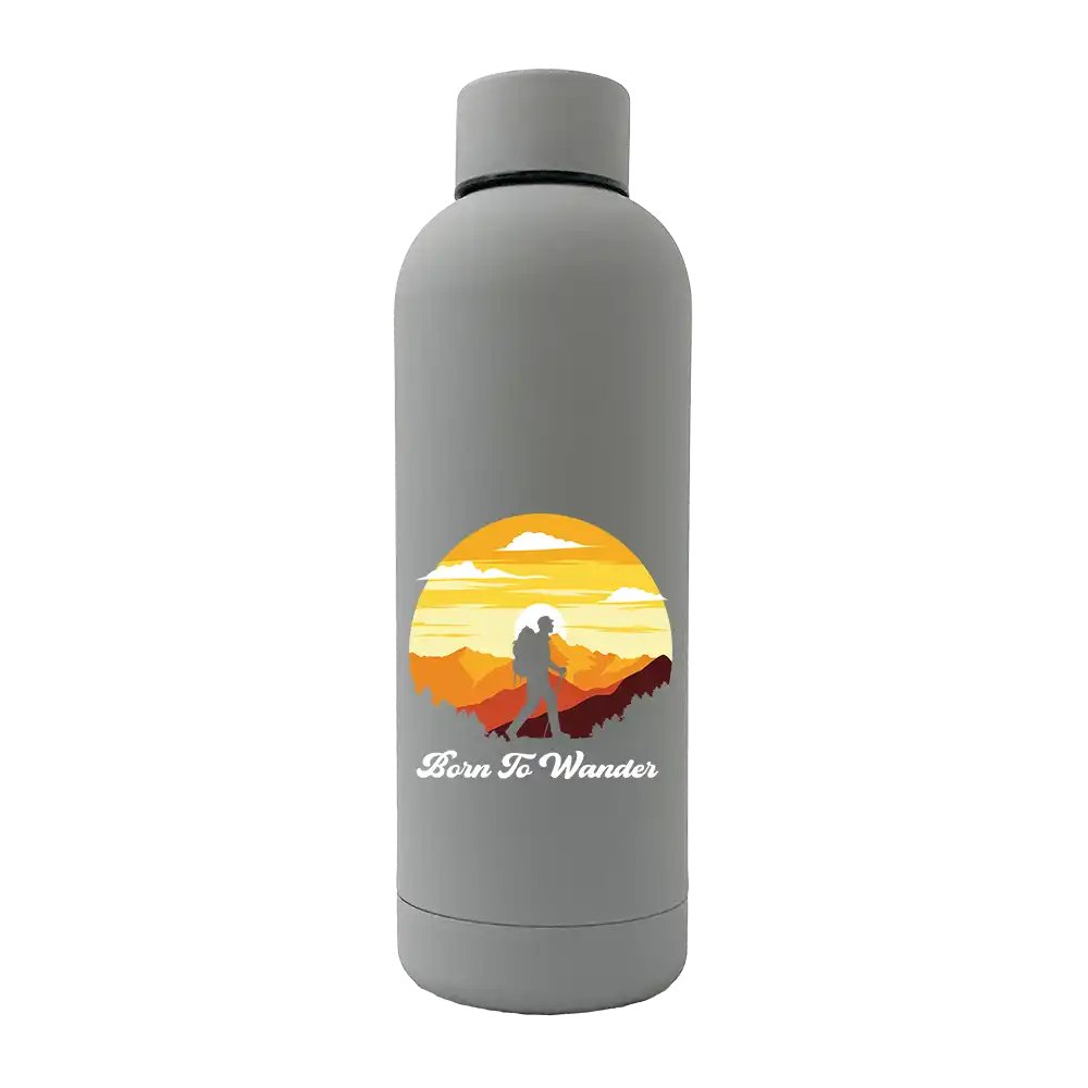 Born To Wander 17oz Stainless Rubberized Water Bottle with a vibrant UV printed design, showcasing its durable stainless steel and rubberized coating.