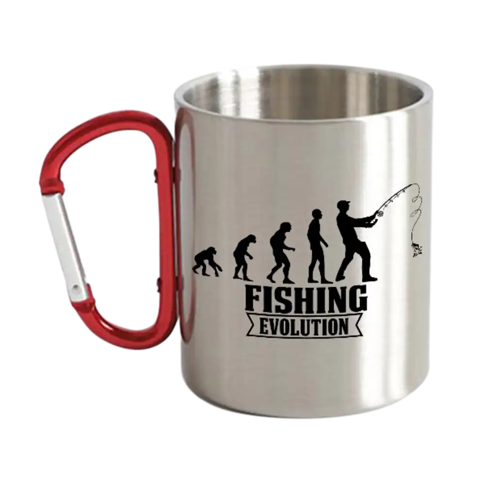 Fishing Evolution Carabiner Mug 12oz with UV printed design, showcasing its durable stainless steel and ceramic construction.